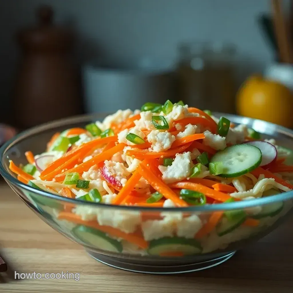 - Assemble the Salad: Toss 8 oz of shredded imitation crab with your crunch tastic veggies and 1/4 cup toasted sesame seeds in a large bowl.